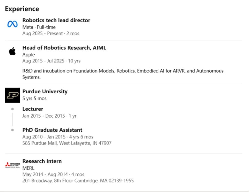 他此前在苹果领导一个专注于自动化技术及AI产品应用的机器人研究团队,隶属AI/ML部门。