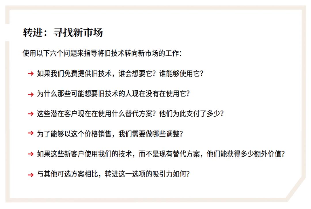 所谓“转进”,指的是利用既有的旧技术去解决同一批顾客的新需求,或是为新的顾客群体解决他们已有的问题。这意味着企业必须主动寻找新的市场机会,同时愿意放弃原有的市场位置。