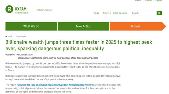 据全球慈善组织乐施会(Oxfam)周一发布的报告,2025年,全球亿万富翁的财富大幅增长,达到创纪录的18.3万亿美元。