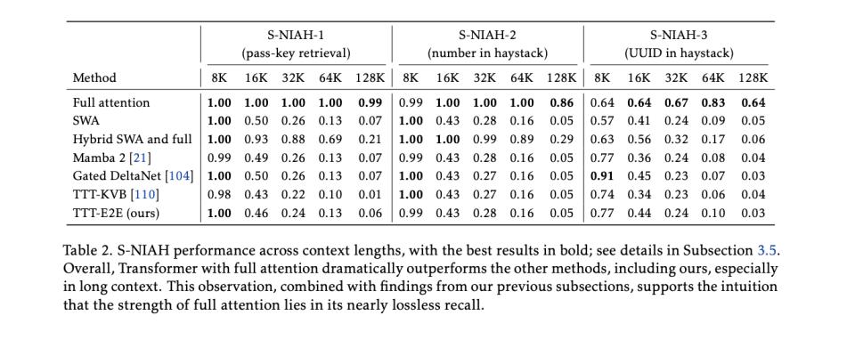 当然,这种方法并非面面俱到。TTT‑E2E 在海底寻针这种需要精确检索的测试上仍然被full attention碾压,包括 TTT‑E2E在内的线性路线一直在长上下文检索上表现并不好。