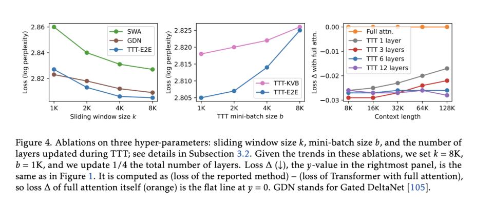 从实验数据看,这个改变确实带来了实质性的提升。在760M参数的模型上,TTT-KVB在8K上下文的loss为2.818,而将其简化版本改用next-token prediction损失后(TTT-E2E all layers MH),loss降至2.806。