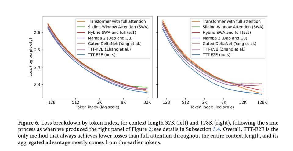 另一项,则是看Loss的收敛速度,Loss收敛的越快,说明模型越高效的在学习。在 32K 和 128K 两种长度下,TTT‑E2E 是唯一一种在整个上下文范围里都能压过 full attention 的方法,而且它的总体优势有很大一部分来自序列更早的位置。