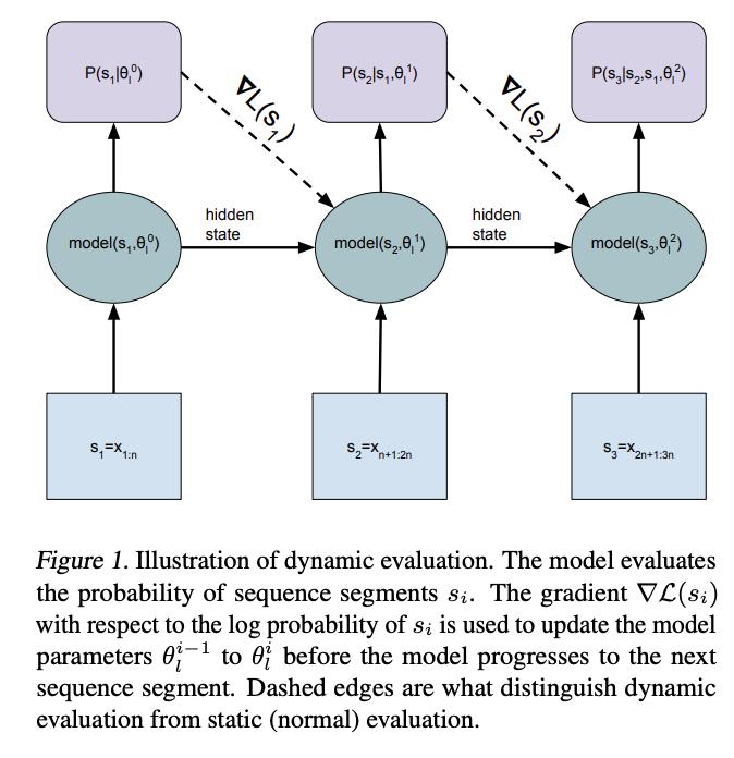 早在2013年,Mikolov 等人就在语言模型里尝试过 dynamic evaluation。当时放的是让模型解除冻结,在测试文本上继续用下一词预测的交叉熵损失 CE(也就是我们最经常理解的大语言模型的参数学习损失目标)做小步梯度更新,让参数对当前文体、主题、局部统计规律发生适应。Krause 等人在 2018 年把它完善得更系统,更可行。