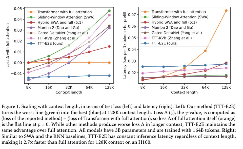 只有 TTT‑E2E 的线几乎像钉住了一样,从 8K 到 128K 没有出现优势稀释的迹象。这说明别人是上下文越长越难学到,而TTT‑E2E 则是越跑越会用上下文。