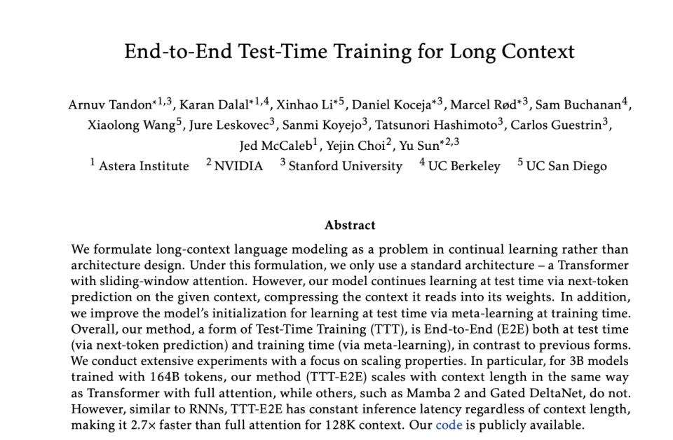 但就在人们还在消化这个想法时,英伟达在2025年12月28日给出了一个更激进的答案,一篇名为《End-to-End Test-Time Training for Long Context》的论文。谷歌的记忆增强路线,还在努力解决记忆问题,把过去重要的东西保存得更完整。但英伟达的研究人员则认为,记忆其实就是学习,「记住」就是「继续训练」。
