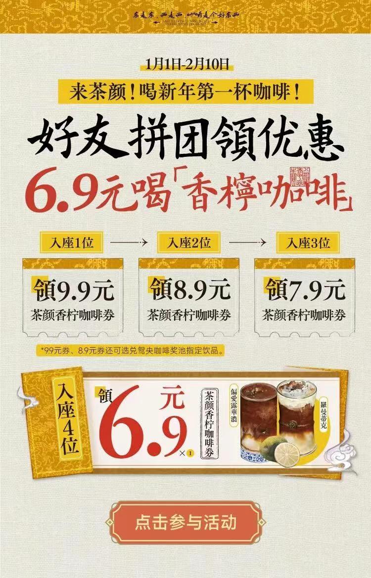 1月伊始,茶颜官宣“开工第一杯”活动,分享好友即可最低6.9元任选一款咖啡。
