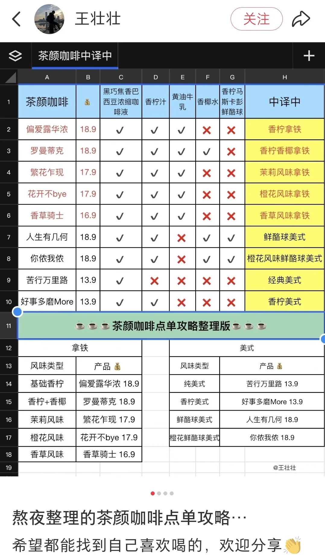 有网友发帖分享全系测评并附上“中译中”菜单,如香柠拿铁、橙花风味拿铁、鲜酪球美式等,用更言简意赅的文字让猜不透的消费者可以“一眼看懂”茶颜咖啡。