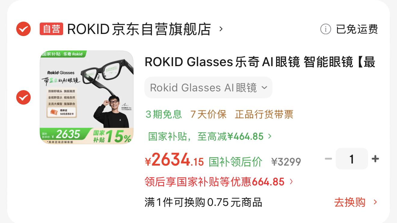以 Rokid 乐奇推出的 Rokid Glasses AI 眼镜为例,目前京东自营 3099 元,在领取国补后可以再便宜 464.85 元,低至 2634.15 元。