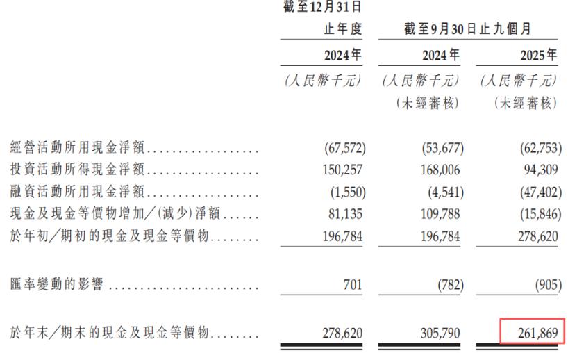 2024年及2025年1-9月(报告期),公司分别录得亏损2.2亿元、9433万元,研发开支分别为1.45亿元、8164.2万元,经营活动所用现金净额分别为6757.2万元、6275.3万元。