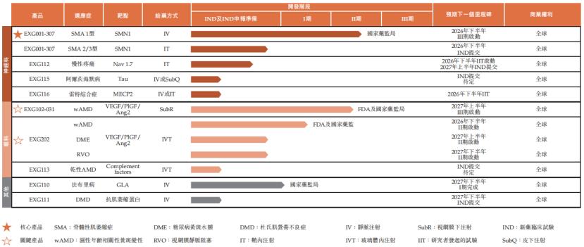 2、两款关键候选产品,即EXG102-031,一种用于治疗湿性年龄相关性黄斑变性(wAMD)的基于AAV的基因疗法;EXG202,一种用于治疗眼底新生血管疾病的基于AAV的基因疗法。