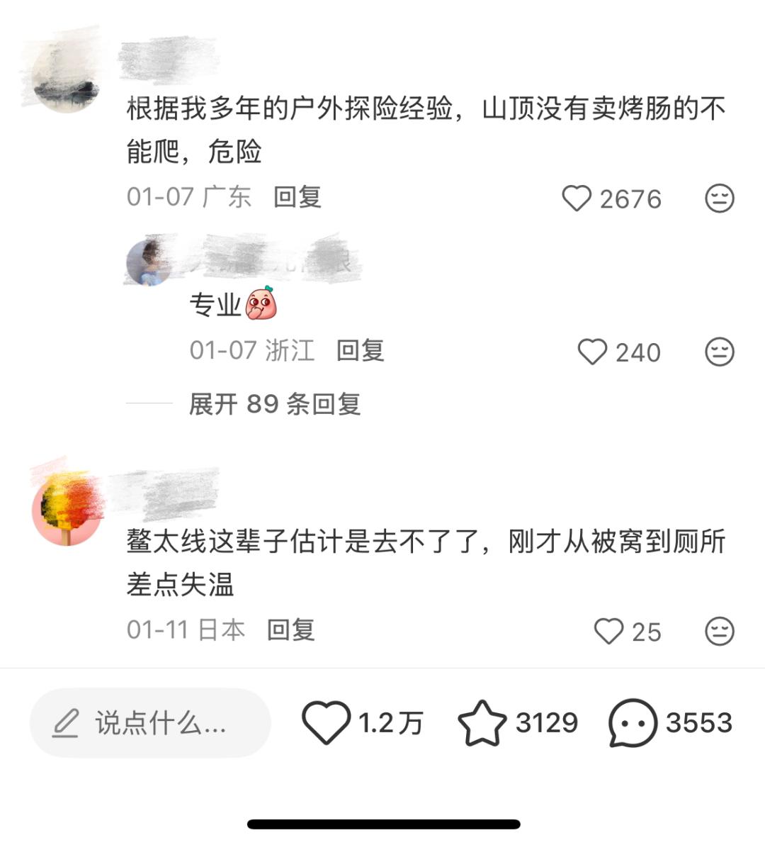 甚至有人用AI自制文字游戏,足不出户就能在家中穿越鳌太线,而「失温」「重装」等专业词汇也迅速普及。与此同时,是所有内容在社交媒体语境中的必然经历,鳌太线的传说也迅速从一个个具体的故事和人,转向一种叙事方式和无数个梗。