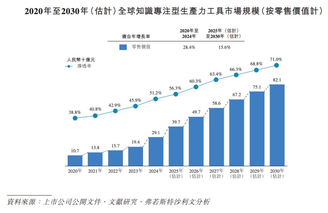 就整体市场规模而言,全球知识专注型智能工具市场近年来保持持续增长态势。2020年至2024年,其全球市场规模从人民币277亿元增长至人民币569亿元,复合年增长率约为19.7%。市场增长主要得益于学习及知识工作场景中对文本密集型处理需求的增加、教育及专业文件数字化持续推进,以及产品形态及配置升级。