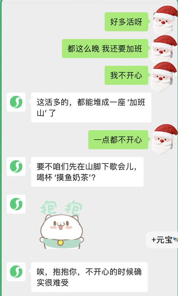 日常聊天、评论区接梗造梗、日常工作元宝似乎都很有一手。用户不开心时,一句“宝,抱抱你”,然后几个可爱的猫猫狗狗表情包;用户一句“不想上班”,元宝直接表示帮用户做个PPT、报表。