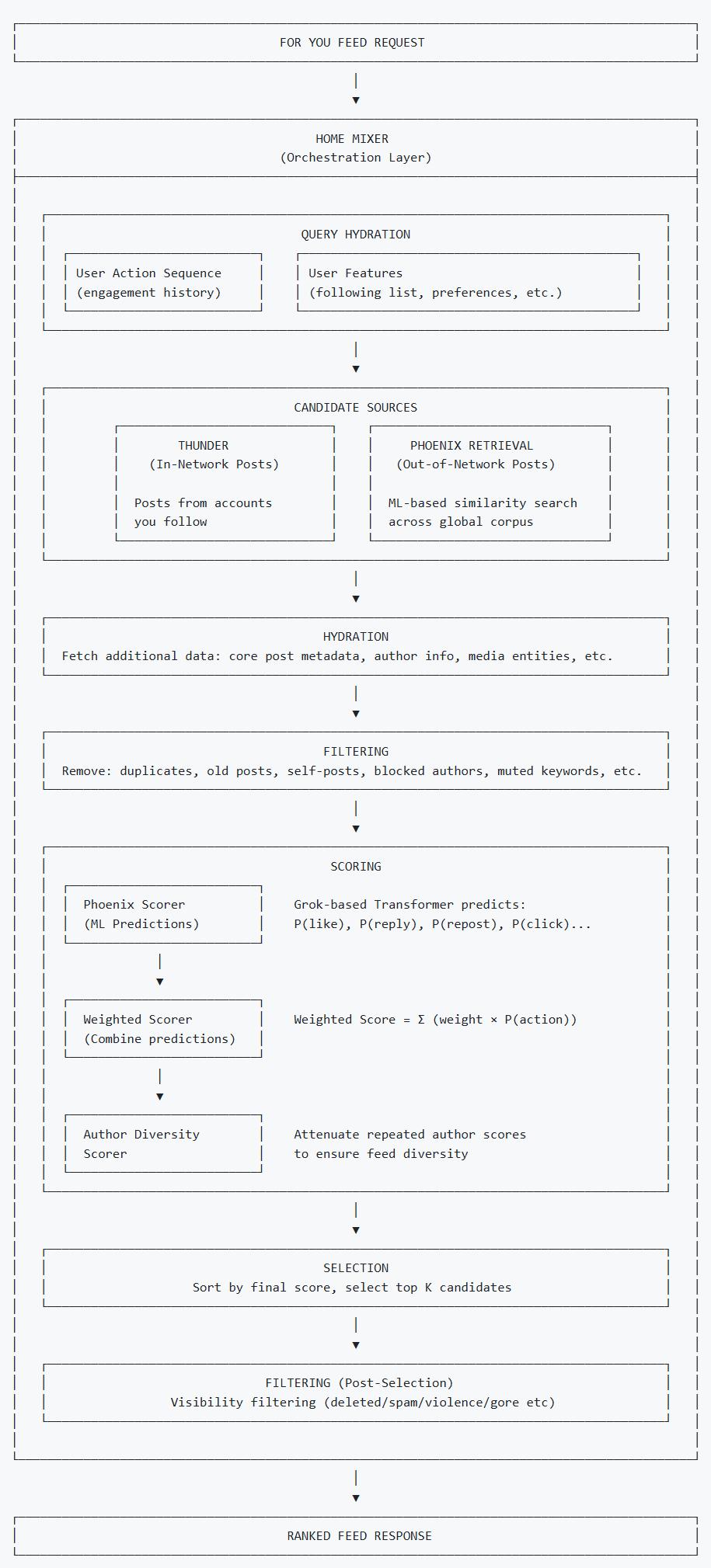 为了让后续打分更精准,算法会对所有候选内容做“信息补全”,譬如补充帖子的文本、图片/视频等核心素材,作者的用户名、认证状态,视频类帖子的时长,以及内容对应的订阅权限等关键信息,确保每一条候选内容的信息维度完整。