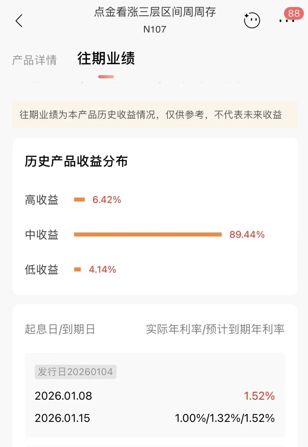 招商银行App显示,该行挂钩黄金的结构性理财产品共15只,多数会展示往期业绩。以“点金看涨三层区间周周存”为例,该产品期限7天,起存金额为1万元,预计到期年利率为1%或1.28%或1.48%。从历史产品收益分布来看,实现低、中、高收益的占比分别为4.14%、89.44%、6.42%。