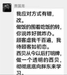 或许是突然被全网群嘲,有截图流出,显示贾国龙在微信聊天中表示应对方式有错,自己要改,并称“彻彻底底向胖东来学习”。