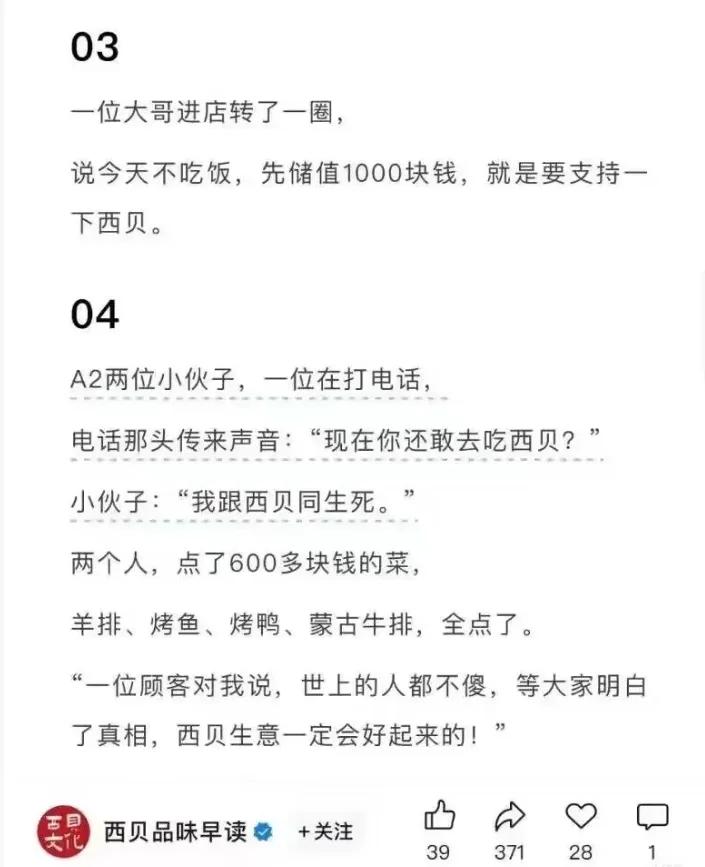 随后,西贝随后被扒出更多类似的内容:《我给大爷一碗汤,大爷要送我北京一套房》、“大哥进店不吃饭,先储值1000块钱支持西贝”、“小伙子两个人点600多块钱的菜,说‘我跟西贝同生死’”等抽象情感故事。