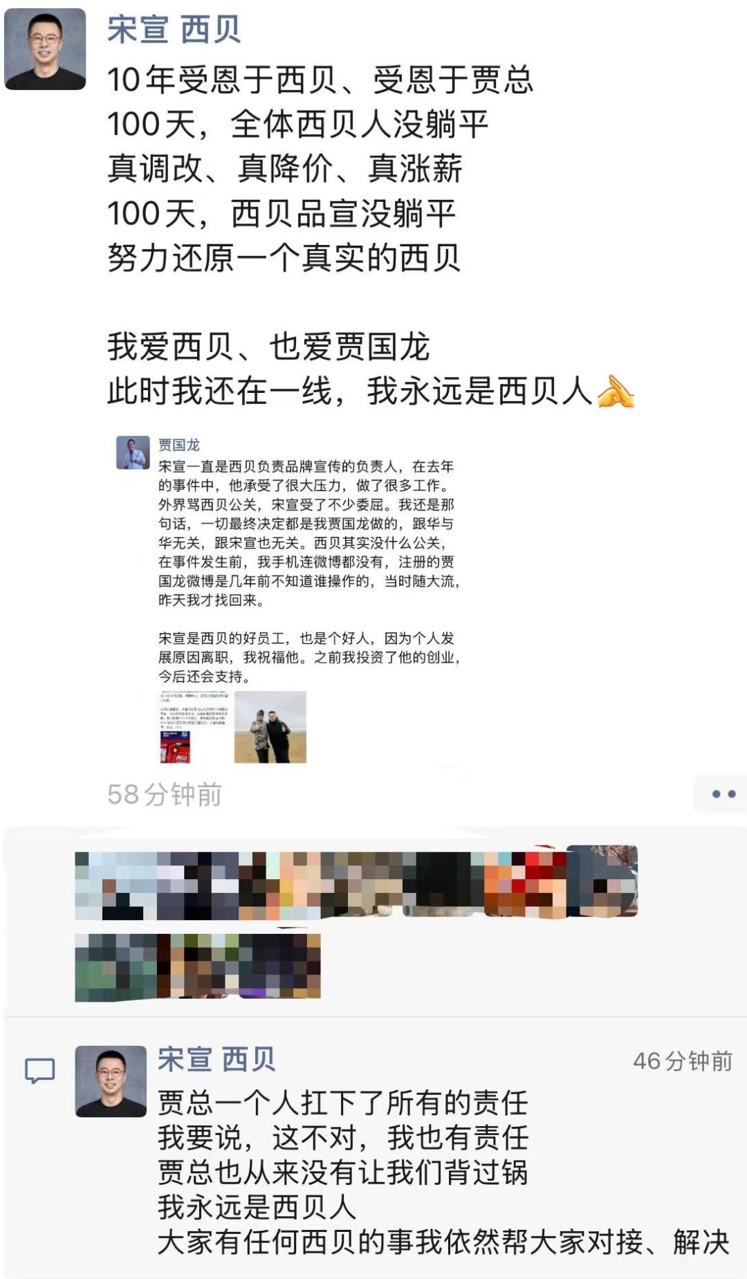又在1 月 16 日,西贝公关副总裁宋宣离职。在朋友圈中,他表示是贾老板“一个人扛下所有责任”。