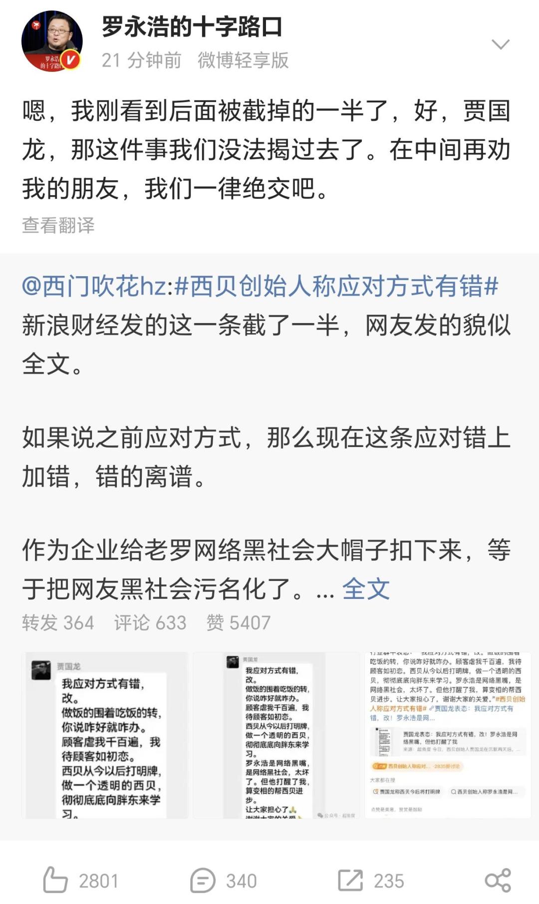 对此罗永浩表示“西贝的事情可以告一段落了”。