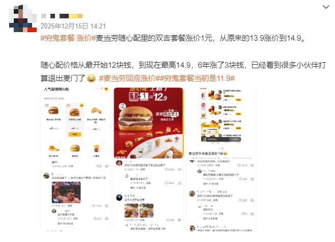 “如果你平时午餐标配是双吉+可乐,从今天开始,你的午餐成本上涨了7%。虽然只有1块钱,但对于我们这种精打细算的打工人来说,伤害性不大,侮辱性极强。”“十年老麦人做证,双吉真的严重缩水!虽然还没到马卡龙的程度,但比两三年前肉眼可见的变小”“我的双吉要加一块钱,所以除了不加钱的这个,里面啥都没有!干巴得很!而且这么小?穷鬼要吃两三个才能饱,穷鬼套餐再见了!下次我只吃优惠券9.9的汉堡了”……在微博、小红书、抖音等社交平台上,关于“穷鬼套餐”变味的讨论迅速升温,不少网友纷纷晒出对比图,控诉麦当劳的“不厚道”。