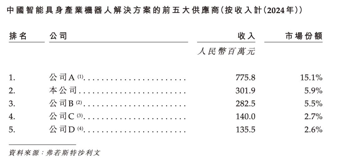 玖物智能的工业机器人售价大约在每台85000元左右。以公司收入计算,玖物智能在其所处的智能具身产业机器人领域的市场份额为5.9%,排名第二。