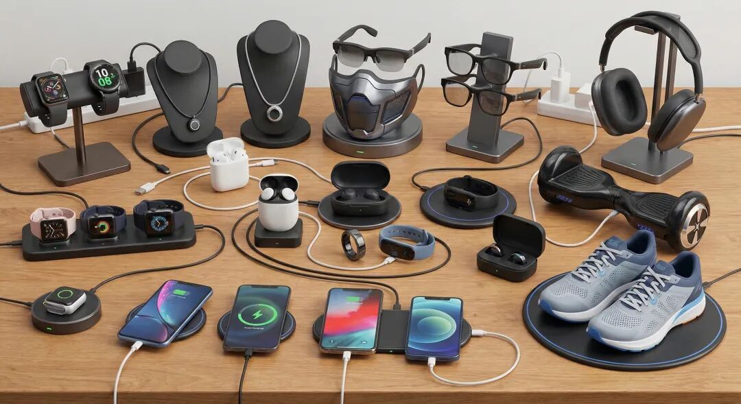 「最充实的一天」终于结束,回到家在红木沙发旁边的红色塑料凳上,你摘下闪灯的智能眼镜和 AI 摄像头耳机,把智能项链和 AI 别针取下来充电,擦擦手指上的智能戒指,便排出九个充电器,把所有低电量的智能穿戴放上去。