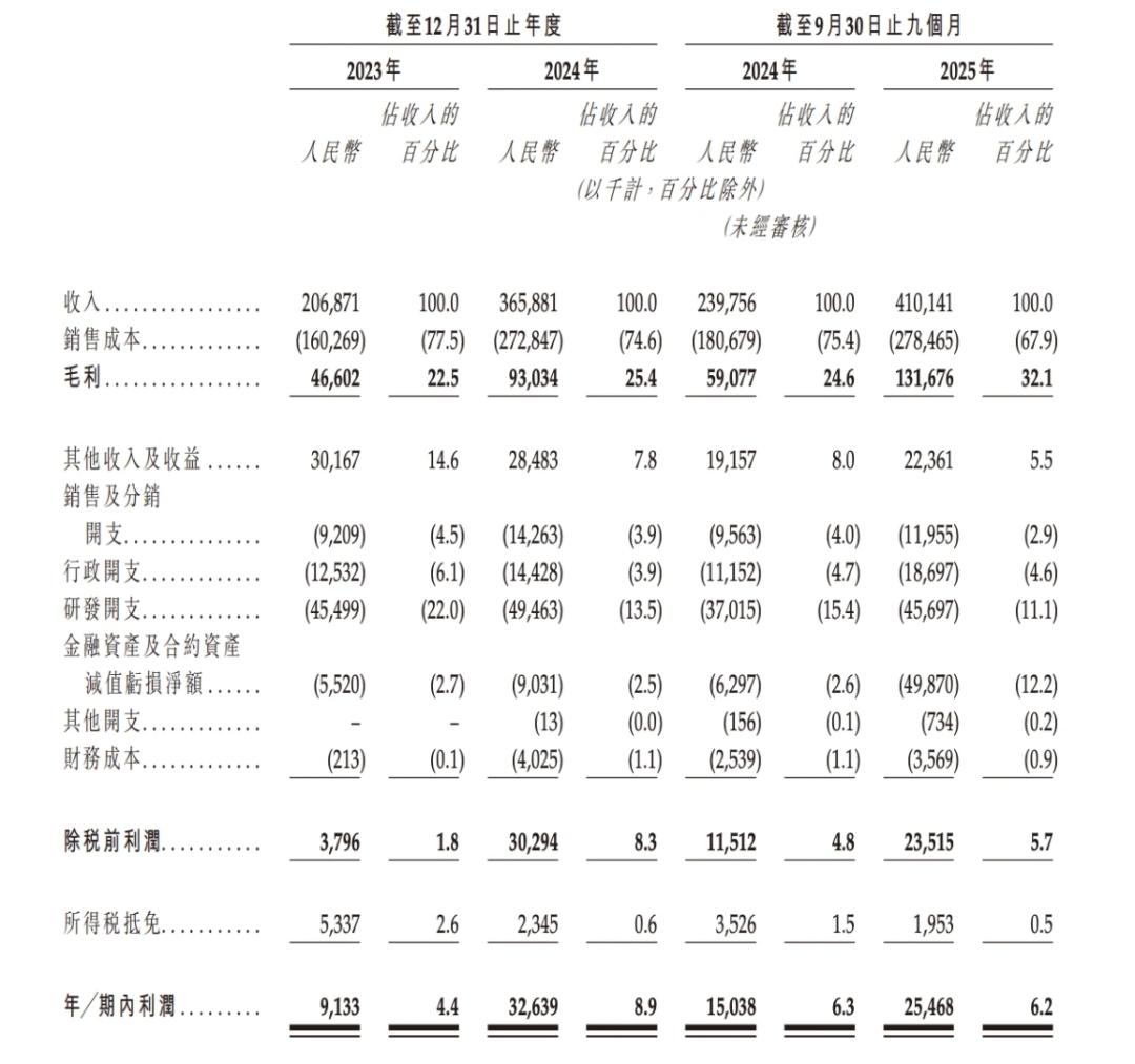 玖物智能营收2023年的2.07亿元增长76.81%至2024年的3.66亿元,2025年前三季度收入进一步增至4.10亿元,较2024年同期增长71.83%;净利润增幅更为显著,2024年达3263.9万元,较2023年的913.3万元暴增257.37%,2025年前三季度净利润2546.8万元,同比2024年同期增长69.36%。盈利能力的快速提升,成为玖物智能冲击港股的核心底气。