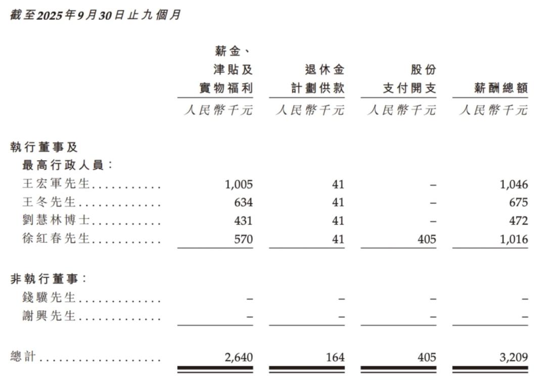 正因如此,玖物智能才具备了参照智能制造行业头部企业标准制定的底气,结合岗位价值、绩效贡献构建了“基础薪酬+绩效奖金+年终奖金”的三维结构,与经营业绩深度绑定。2025年前三季度,以王宏军、王冬、刘慧林、徐红春为代表的最高行政人员总薪资320.9万元,较2024年同期增长14.65%。