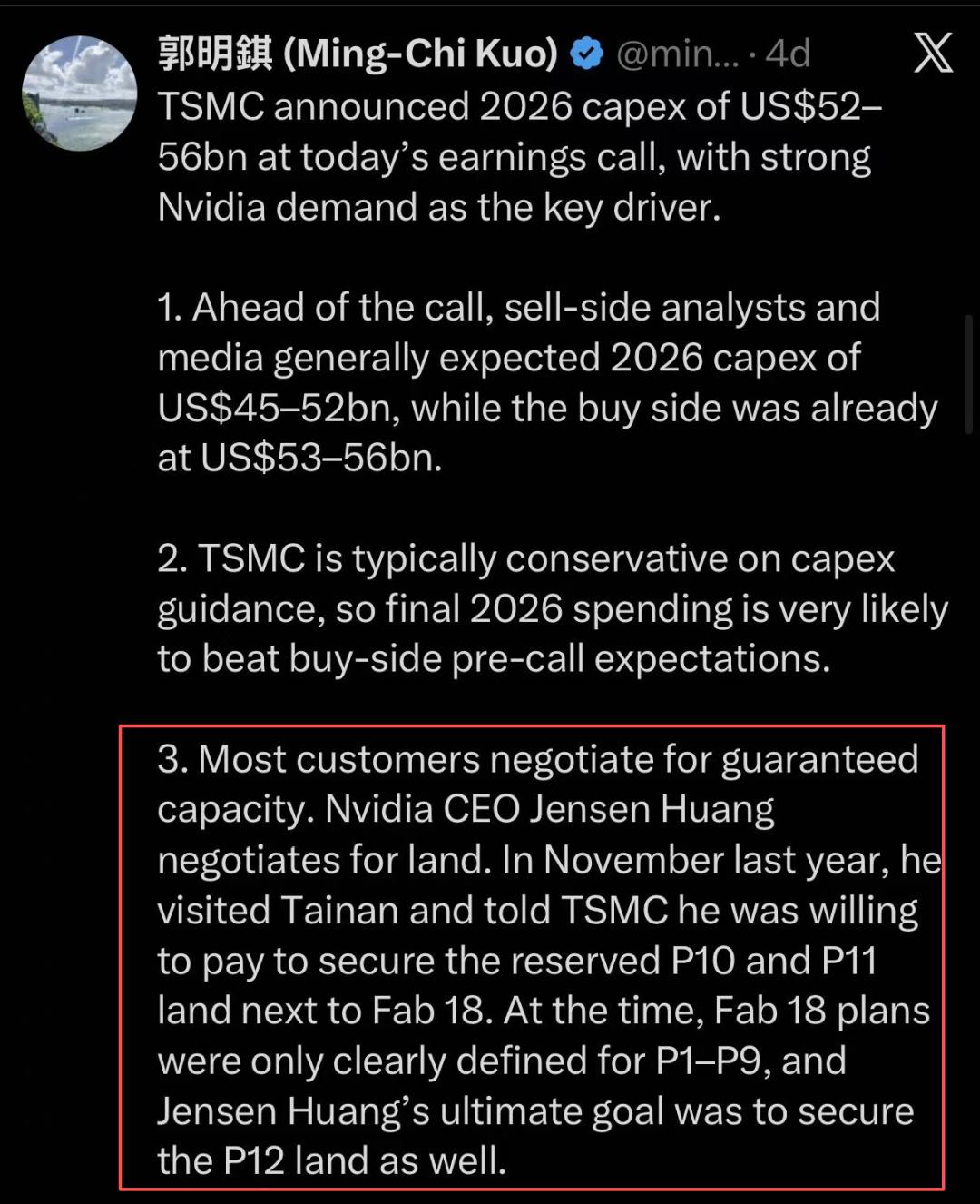 根据台积电董事长魏哲家透露,黄仁勋此行是为了“要更多芯片”[5],知名分析师郭明𫓹又补充了一个细节:黄仁勋指着18厂旁边的地块称,愿意买地包下这部分尚未规划的产能。