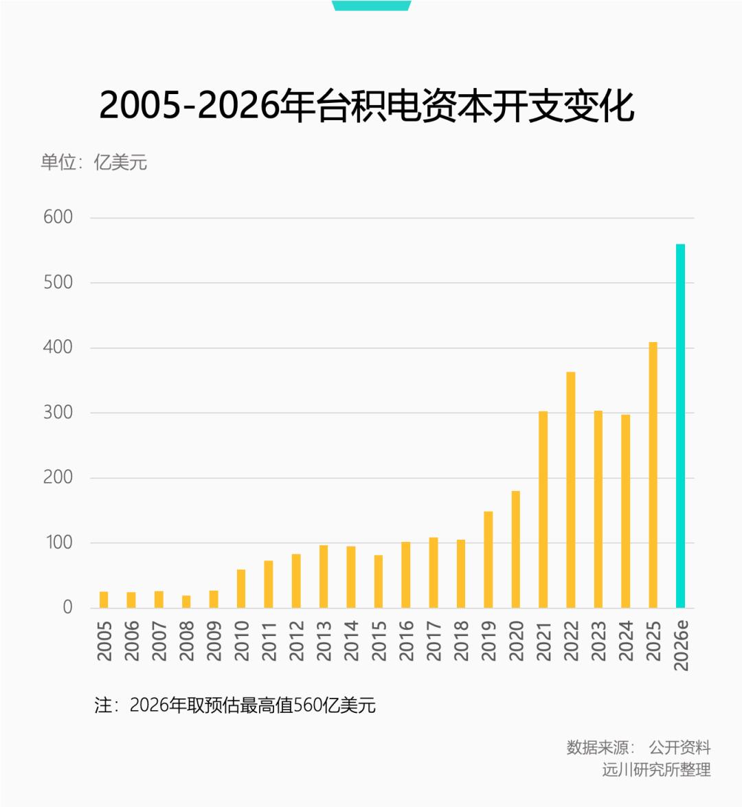 令投资机构振奋的还是资本开支。台积电给出了2026年资本开支520亿到560亿美元的指引,相比2025年全年的409亿美元大幅上涨,给产业送了颗定心丸。