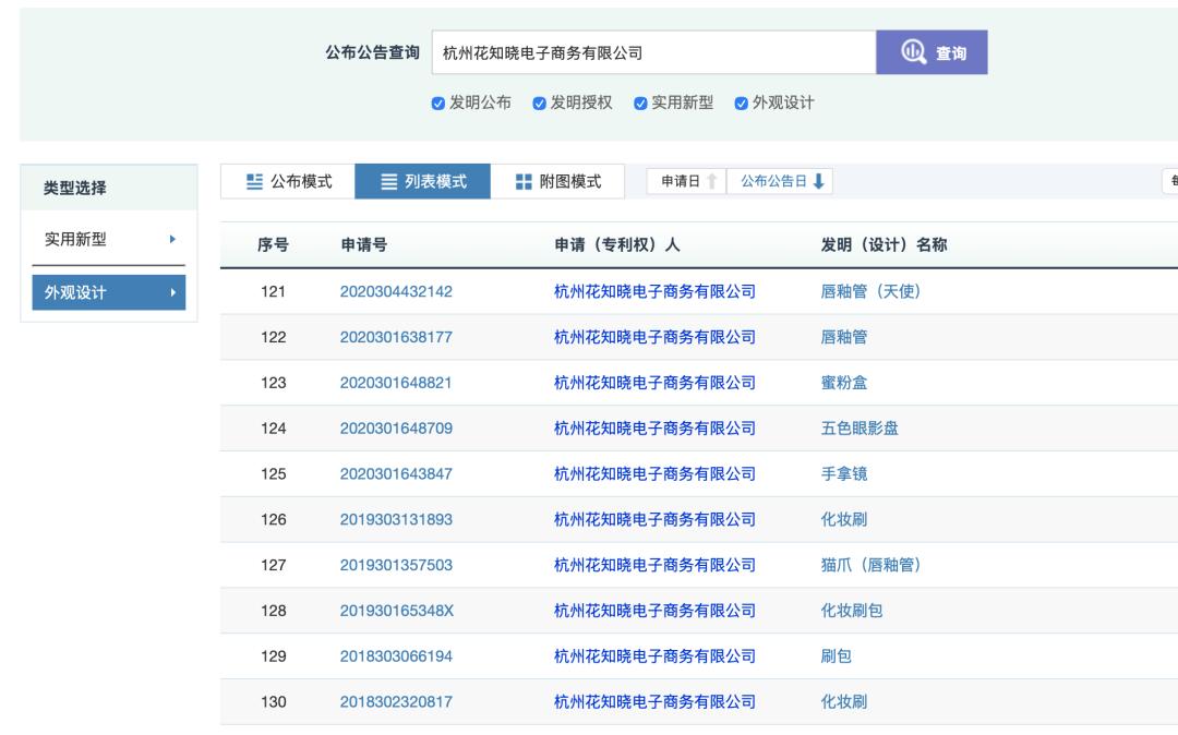 「创业最前线」查询国家知识产权局官网发现,花知晓母公司杭州花知晓电子商务有限公司共有131项专利,其中130项为外观设计专利,1项为实用新型专利。在化妆品成分研发、制备技术等方面,均无相关专利技术。