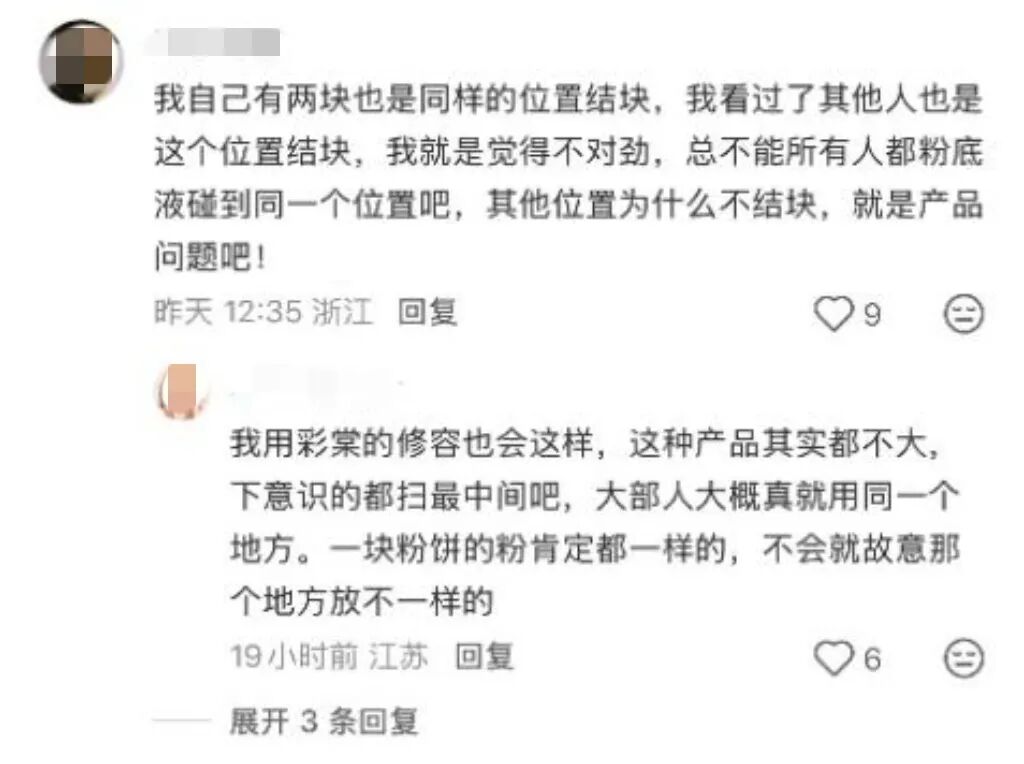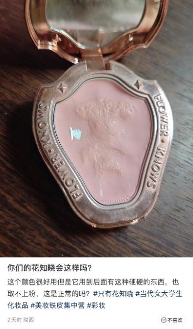 以花知晓腮红为例,有不少用户在社交平台吐槽,用到最后腮红盘上的粉会变硬、结块,取不上粉。