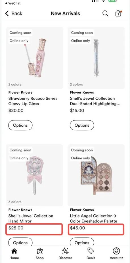 正如一位在美国的网友分享的ULTA截图,一款在天猫售价109元的花知晓小天使九色眼影盘,ULTA上标价45美元(约313元人民币)。而国内很多时候作为赠品的手持化妆镜,标价则是25美元(约174元人民币)。