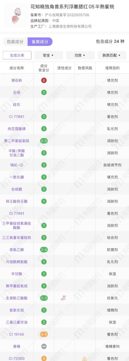 以花知晓畅销单品“独角兽系列浮雕腮红”为例,排在备案成分表第一位就是滑石粉。作为一种广泛使用在化妆品中的成分,滑石粉因在开采过程中存在与1类致癌物石棉交叉污染的风险,近年引发诸多关注。