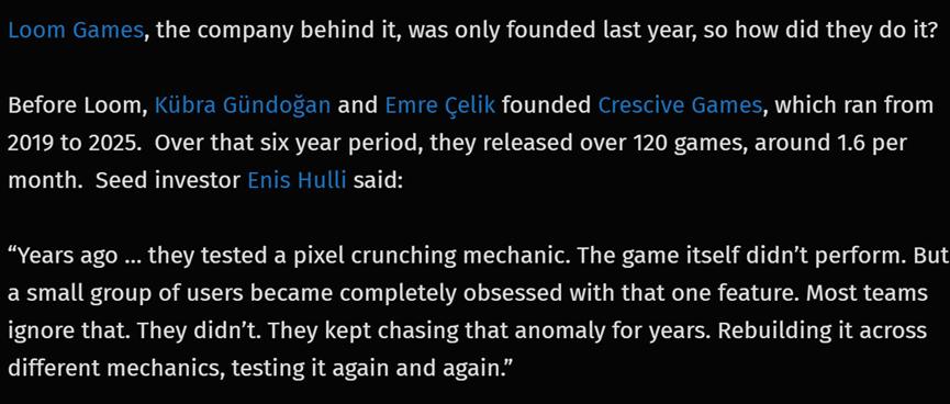 刚成立不久的土耳其小团队 Loom Games 做的「Pixel Flow」,月流水突破千万美元、登顶混休赛道,是混休赛道在 2025 年年末收到的最佳答卷。