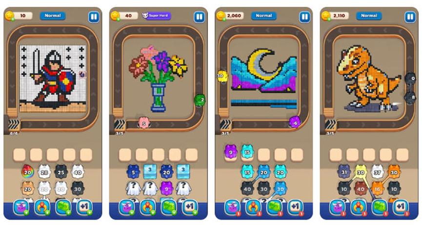 「Pixel Flow」基本相同,主要区别在于把传送带换成和滑板轨道,射手坐上滑板来消除像素画 | 图片来源:AppMagic