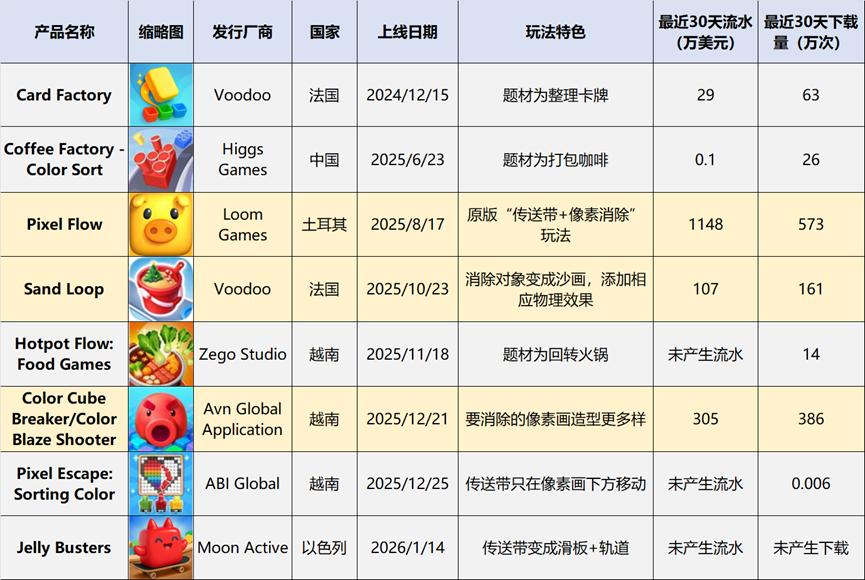 整个“传送带+消除”子类只有「Pixel Flow」、「Color Blaze Shooter」和「Sand Loop」3 款产品月流水突破 100 万美元,也只有这三款产品月下载量突破 100 万次。