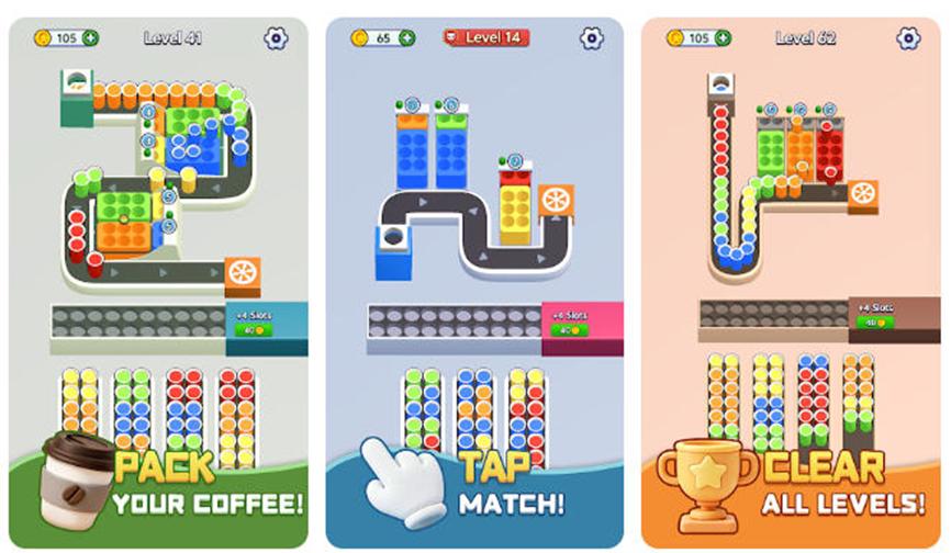 上面提到,最早做传送带的是 Voodoo,主打“传送带+卡牌整理”。另一个比较有意思的玩法创新来自国内厂商 HIGGS(AppMagic 显示账号注册地址为中国,有媒体显示背后厂商为波克城市),把题材变成了打包咖啡配送外卖。