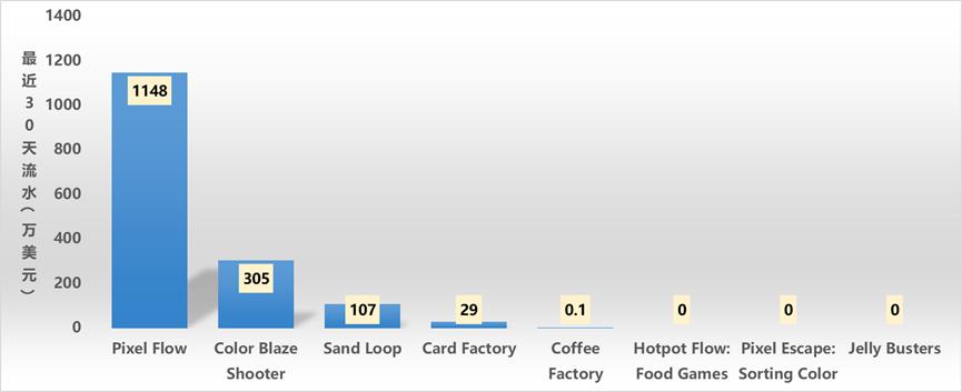 由于「Pixel Flow」自上线以来至今不到半年时间,玩法体验高度相似的同类竞品最快也在 2025 年 10 月末才上线,因此「Pixel Flow」的先发优势挺大,月流水达到了 1148 万美元(约合 7991 万人民币)。