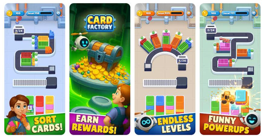 Voodoo 旗下的「Card Factory」是最早尝试“传送带+消除”的混休游戏,该游戏选择把传送带和卡牌分类结合在一起 | 图片来源:AppMagic