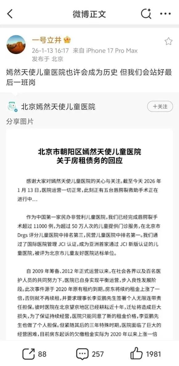 舆论风向大变,源自一则视频。2026年1月14日,李亚鹏发布名为《最后的面对》无剪辑的31分钟视频,详细解答了北京嫣然天使儿童医院因拖欠2000万租金而面临迁址甚至关停的经过与感想,称十年完成11000台唇腭裂手术,7000名患儿全额免费,过去5年付租金2500万。