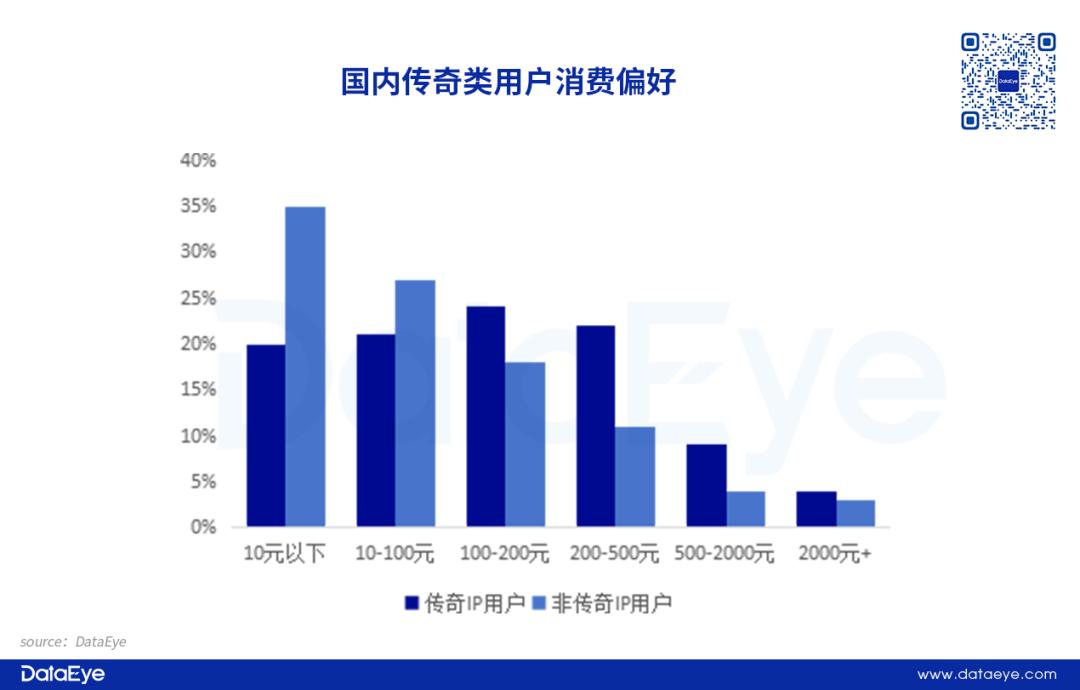 付费偏好数据方面,传奇IP用户和非IP用户的付费场景主要集中在装备强化、角色升级、特权服务等方面。下沉市场用户偏好小额高频付费,一、二线城市用户更接受大额付费以获取优质体验。数据显示,传奇IP用户付费金额以100-500元区间占比最多,合计占比超过46%。非传奇IP用户付费金额在10元以下占比约35%,但有约3%的非IP用户付费金额超过2000元。