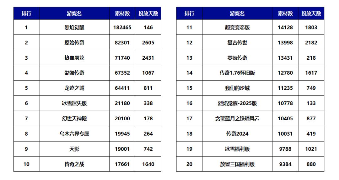 2025年传奇类手游投放格局马太效应凸显,TOP20产品总素材量达68.21万,其中TOP3产品占比 49.33%,TOP10 产品占比更是高达83%。产品方面,玩心不止的《烈焰觉醒》18.25万素材量断层领先。