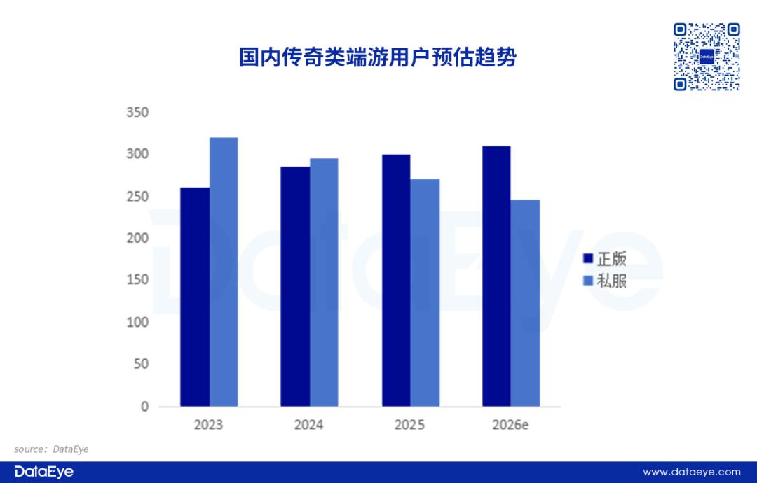 端游作为经典传奇IP的守护者,在2025年用户规模约为570万人,同比下滑1.7%。端游本身拥有提供原汁原味体验的产品优势,尤其吸引核心用户群体,而且这部分核心用户的忠诚度高,形成传奇类游戏的绝对基本盘。只是在时代浪潮下,移动端优势明显,端游用户规模逐渐下滑。可是值得注意的是,端游的正版用户呈现持续增长态势,私服用户逐年下滑。