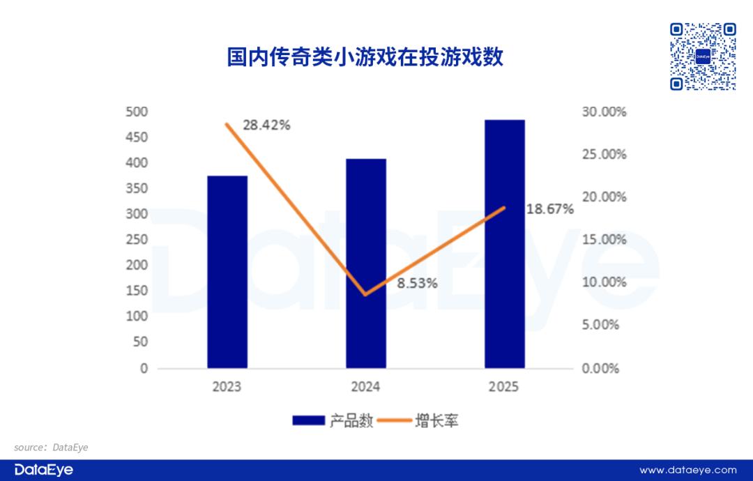 对比来说,传奇类小游戏在投游戏数自2023年开始实现连续上涨。DataEye研究院统计,2025年传奇类小游戏在投游戏数约480款,较2024年增长约18.67%。而且全年新增在投小游戏数149款,同比增长22.13%。