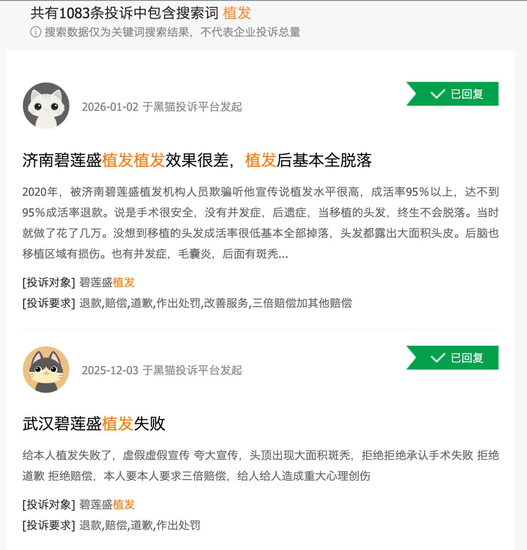 在裁判文书网和第三方投诉平台“黑猫”上,也可以看到大量关于植发行业虚假宣传、种植效果不理想、毛囊发炎、手术中临时换医生等术后纠纷。