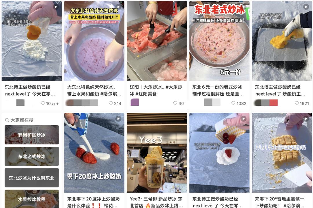 东北博主们晒出的户外炒冰视频动辄收获上万点赞:在冰面上铺一层垫纸,将水果、果汁、酸奶等混合铺匀,等待冷冻成型,网友直呼“雪地就是大型天然炒冰机”。