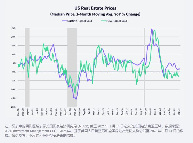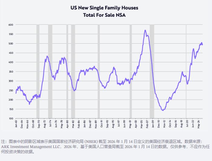 具体来看,Cathie Wood认为,尽管过去三年实际GDP持续增长,但美国底层经济实则经历了一场滚动式衰退,目前正处于“蓄势待发”(coiled spring)的状态,有望在未来几年强劲反弹。