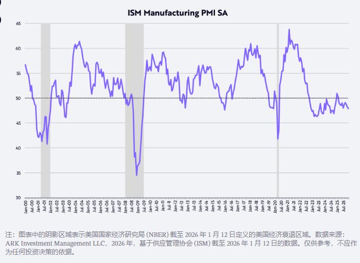 以美国采购经理人指数(PMI)衡量,制造业已连续约三年处于收缩状态。根据这一扩散指数,50是扩张与收缩的分界点,如下图所示。