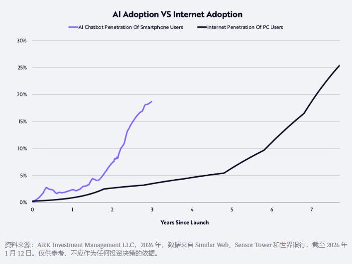 AI公司是历史上增长最快的企业之一。我们的研究表明,消费者接受AI的速度是上世纪90年代接受互联网速度的两倍,如下所示。